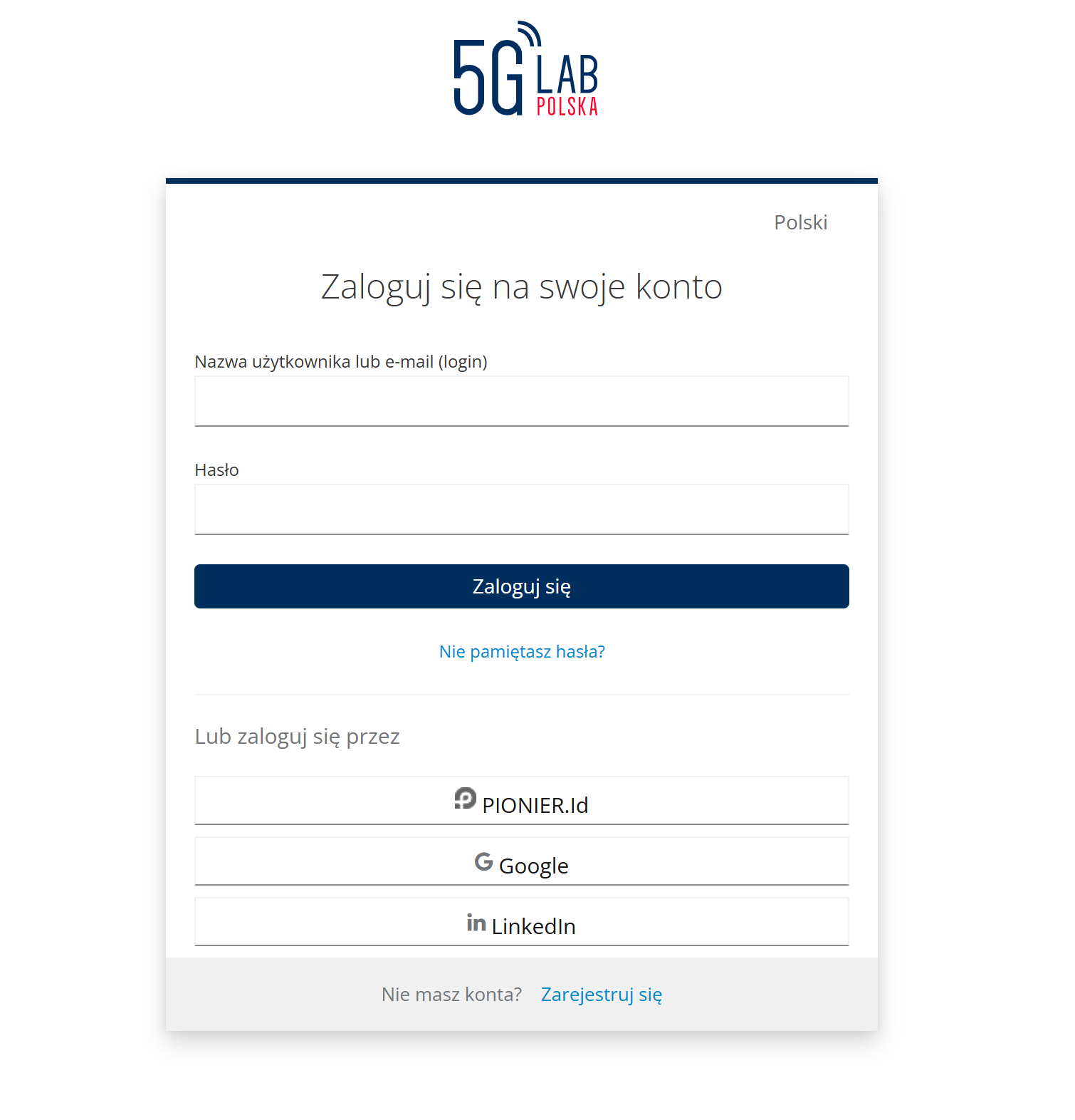 Logowanie za pomocą PIONIER.Id – Po wybraniu tej opcji użytkownik zostaje przekierowany na stronę PIONIER.Id, gdzie wprowadza dane uwierzytelniające swojego dostawcy tożsamości w ramach federacji.